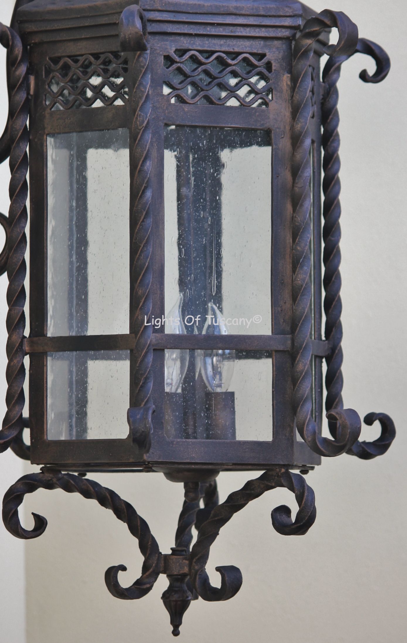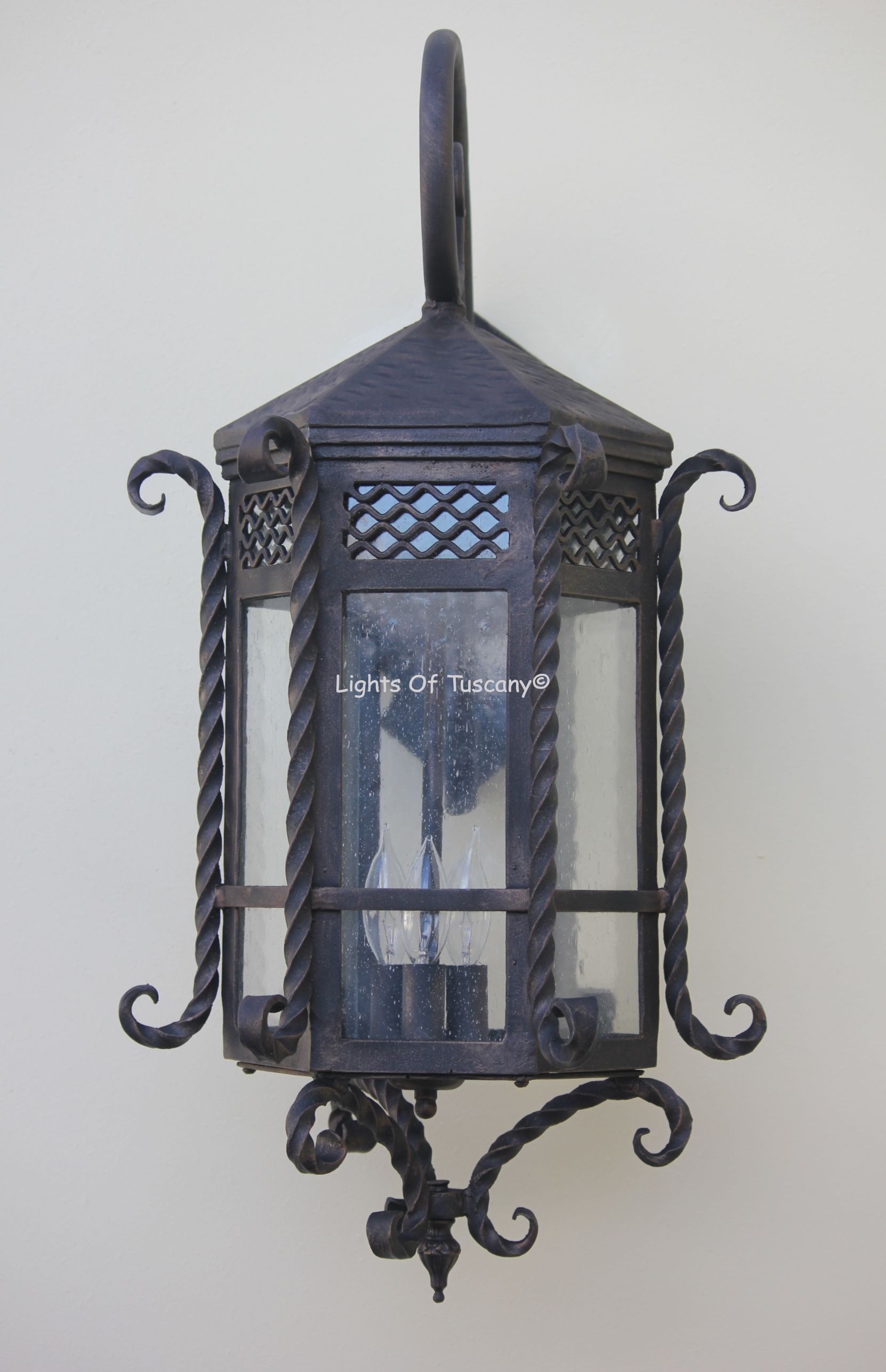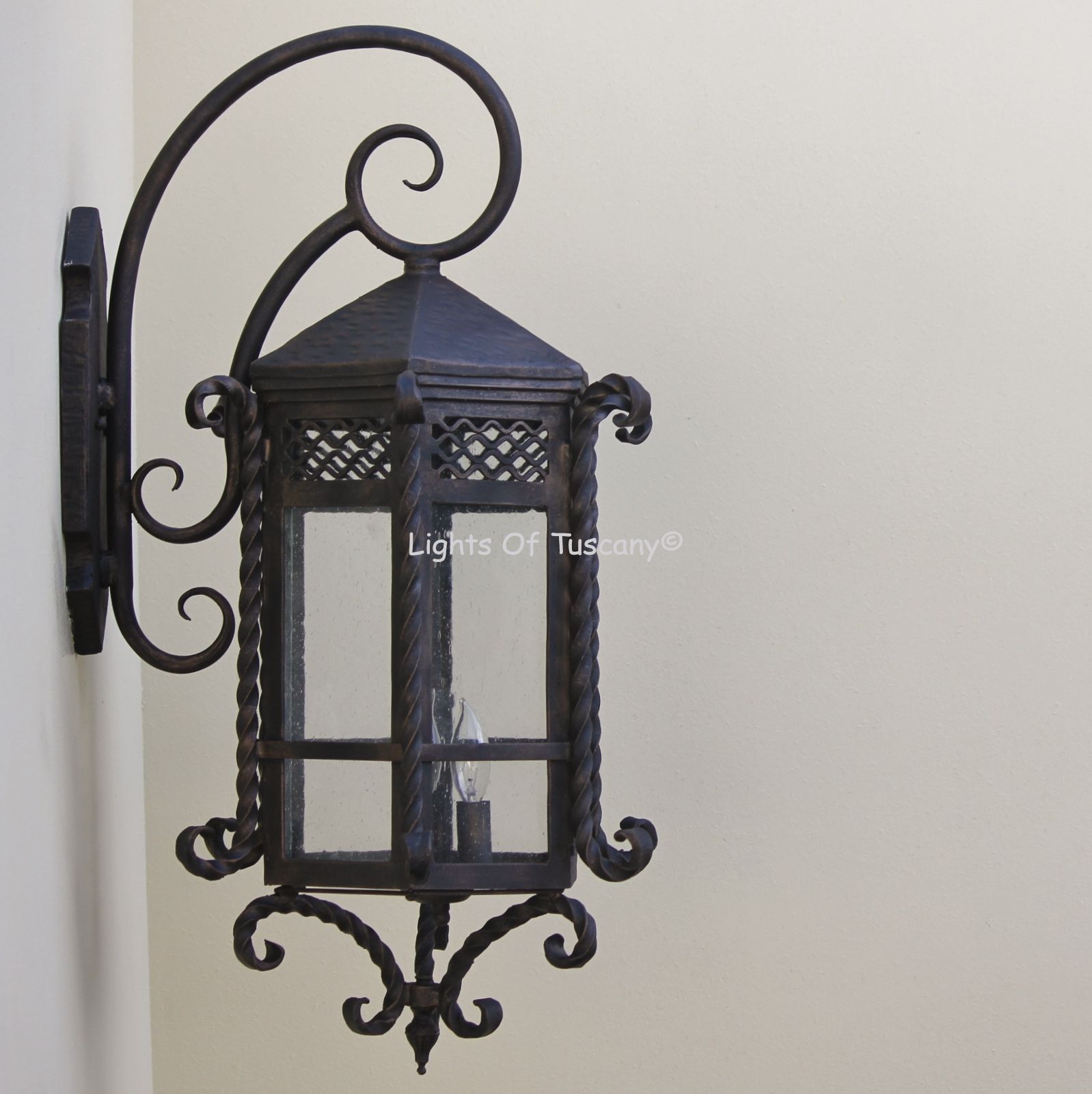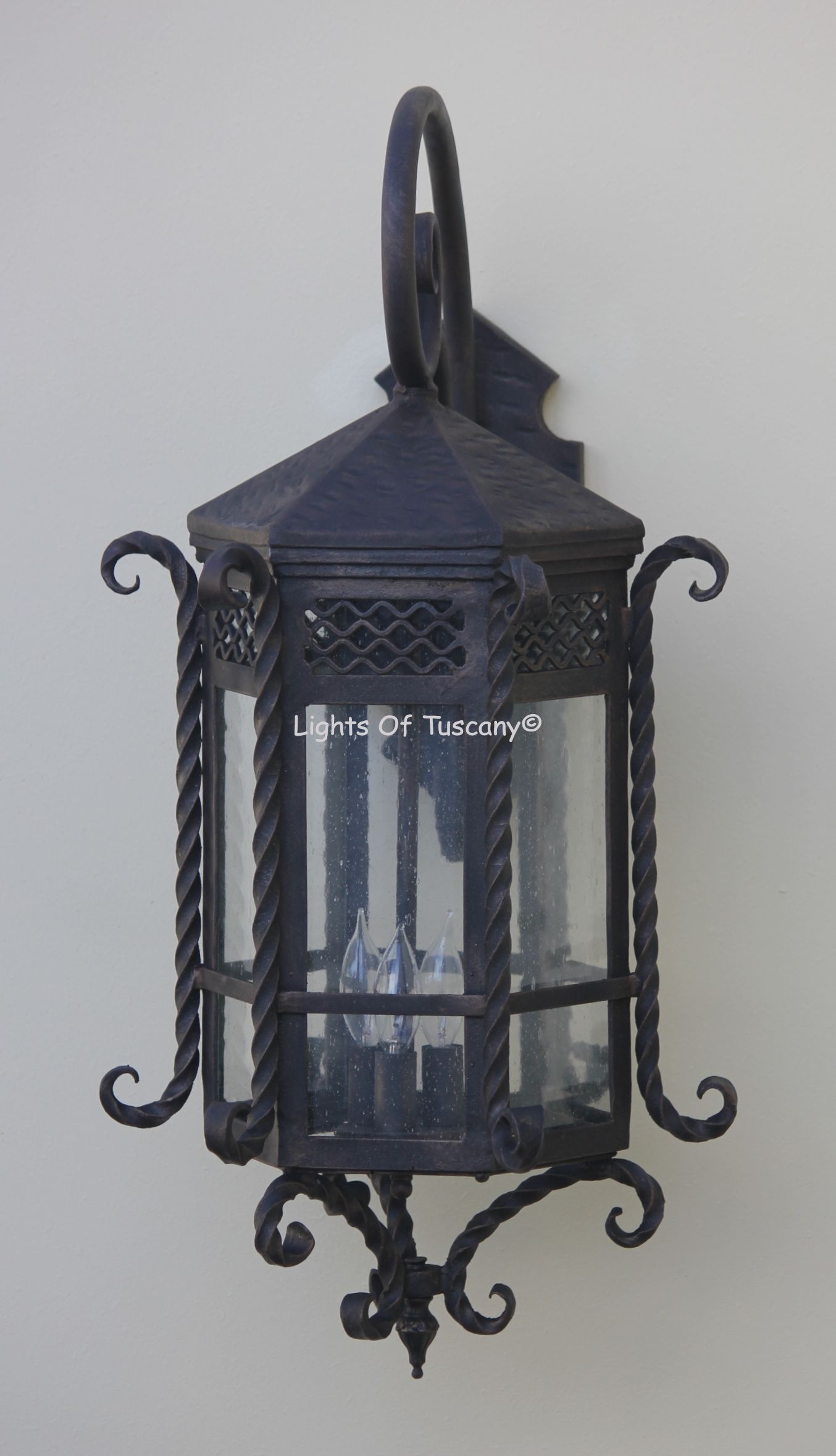 This beautiful hand crafted outdoor wall light is made of all authentic hand forged wrought iron. All our fixtures are hand painted and available in any of our finish options. This fixture is perfect for garage lighting, outdoor walls, backyard and patio lighting.