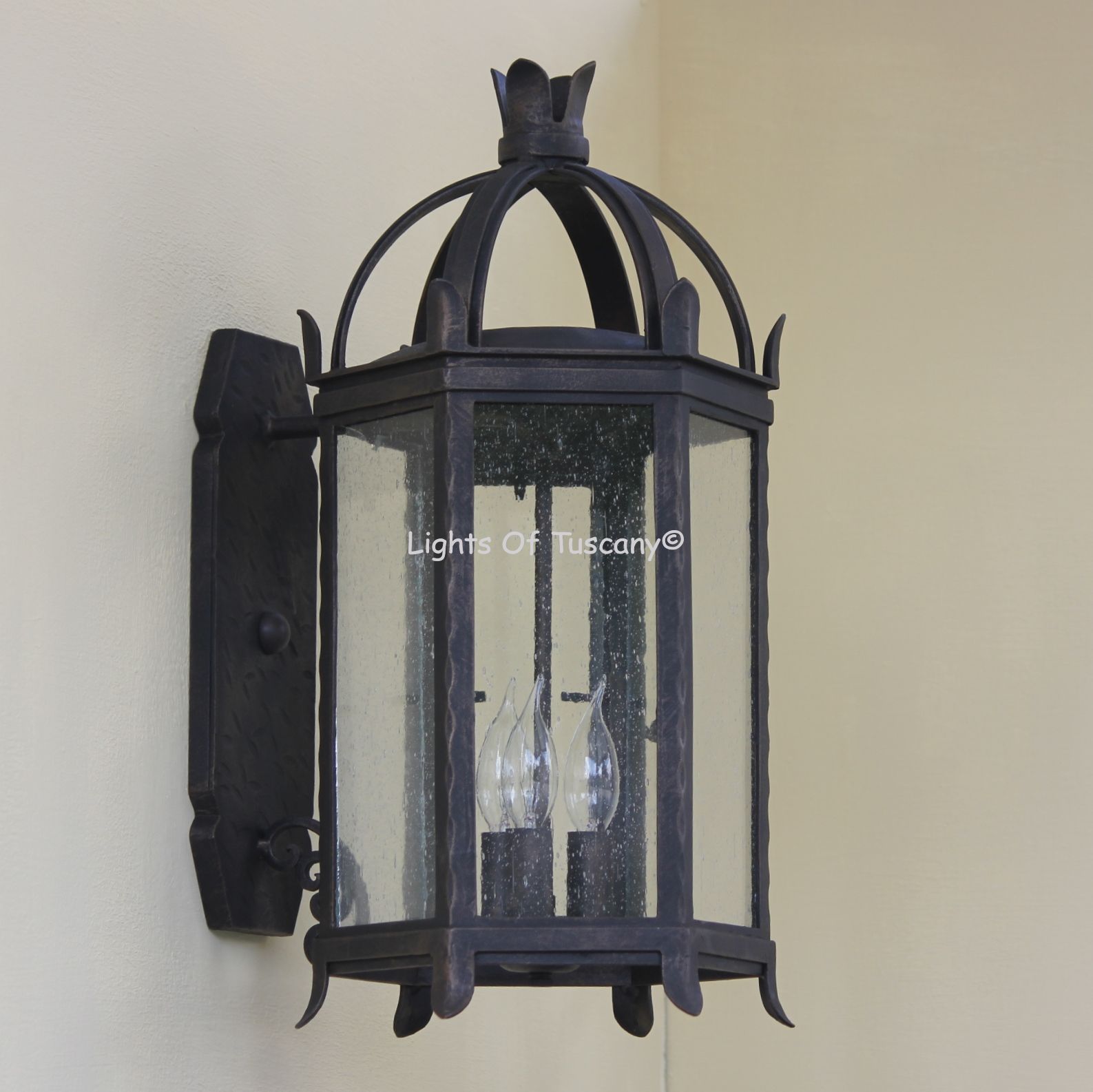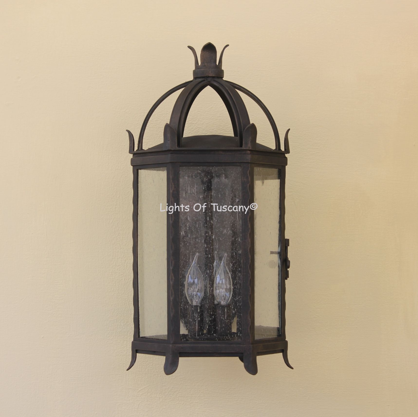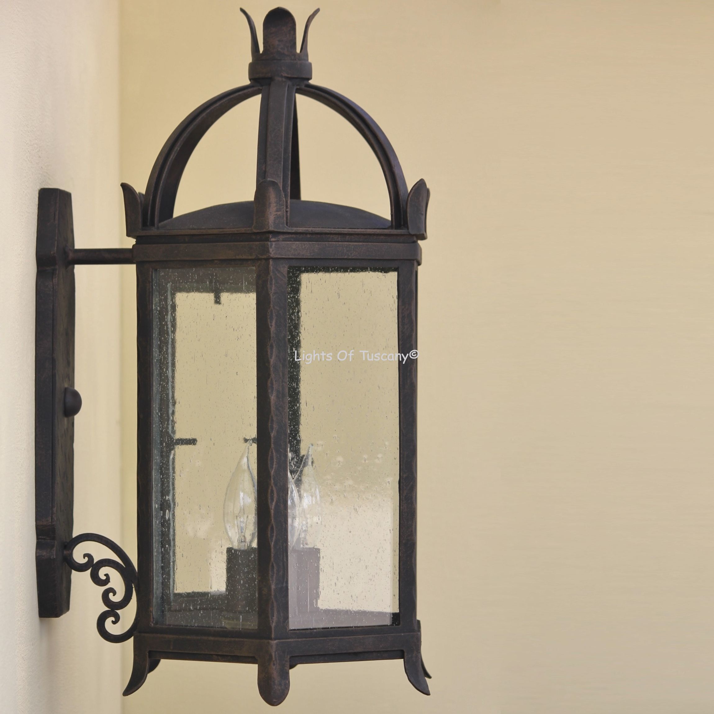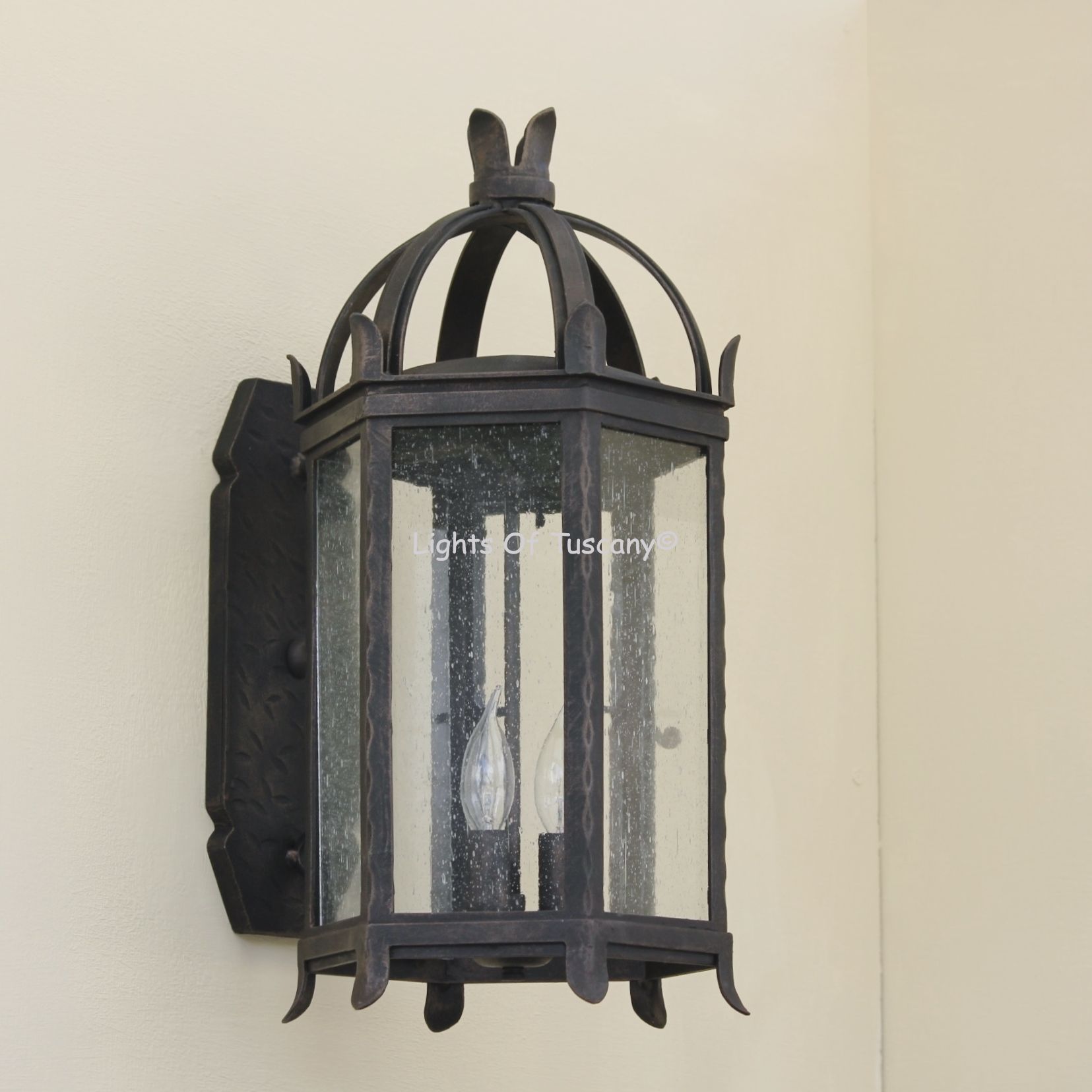 This beautiful hand crafted outdoor wall light is made of all authentic hand forged wrought iron. All our fixtures are hand painted and available in any of our finish options. This fixture is perfect for garage lighting, outdoor walls, backyard and patio lighting.