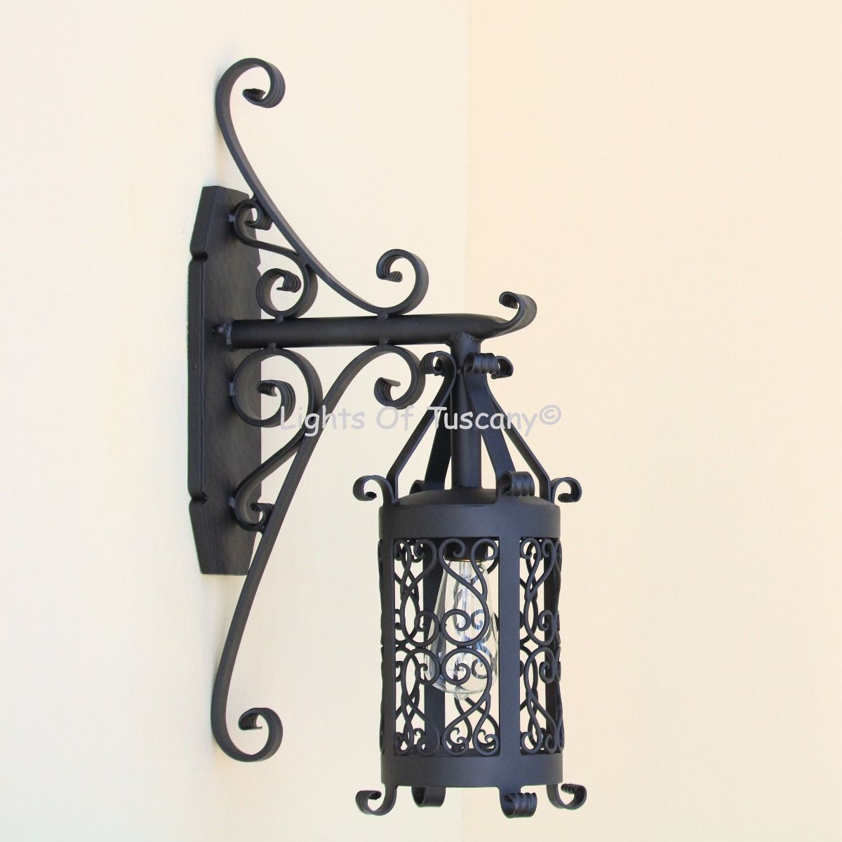 This beautiful hand crafted outdoor wall light is made of all authentic hand forged wrought iron. All our fixtures are hand painted and available in any of our finish options. This fixture is perfect for garage lighting, outdoor walls, backyard and patio lighting.