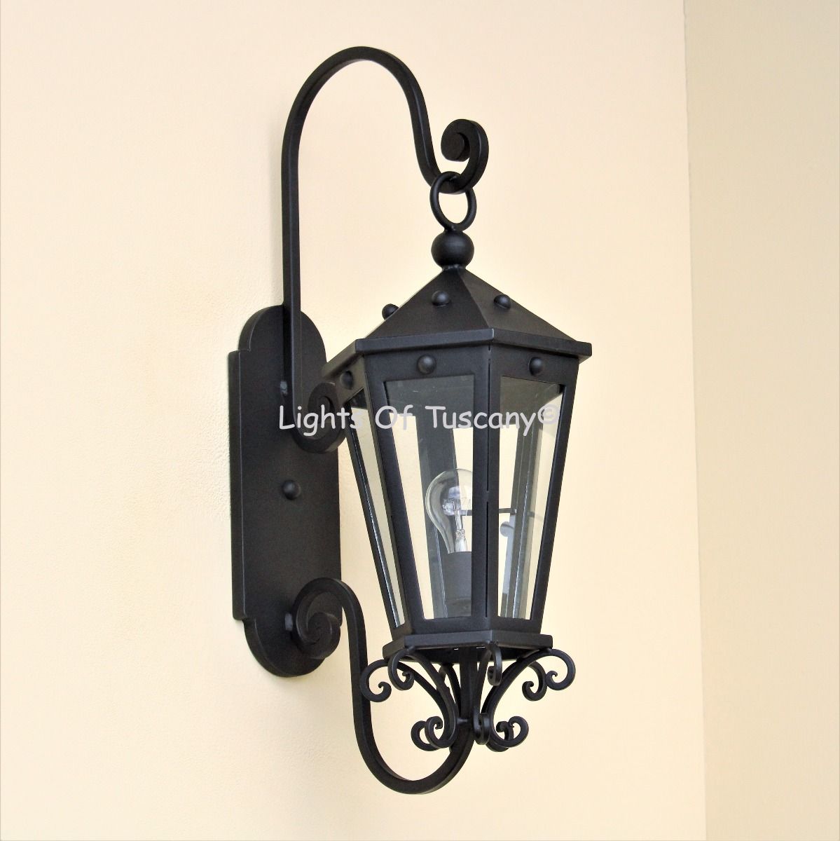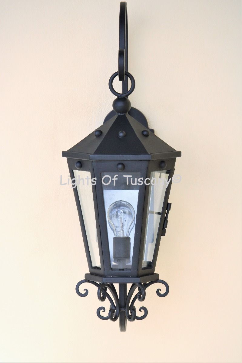 This beautiful hand crafted outdoor wall light is made of all authentic hand forged wrought iron. All our fixtures are hand painted and available in any of our finish options. This fixture is perfect for garage lighting, outdoor walls, backyard and patio lighting.