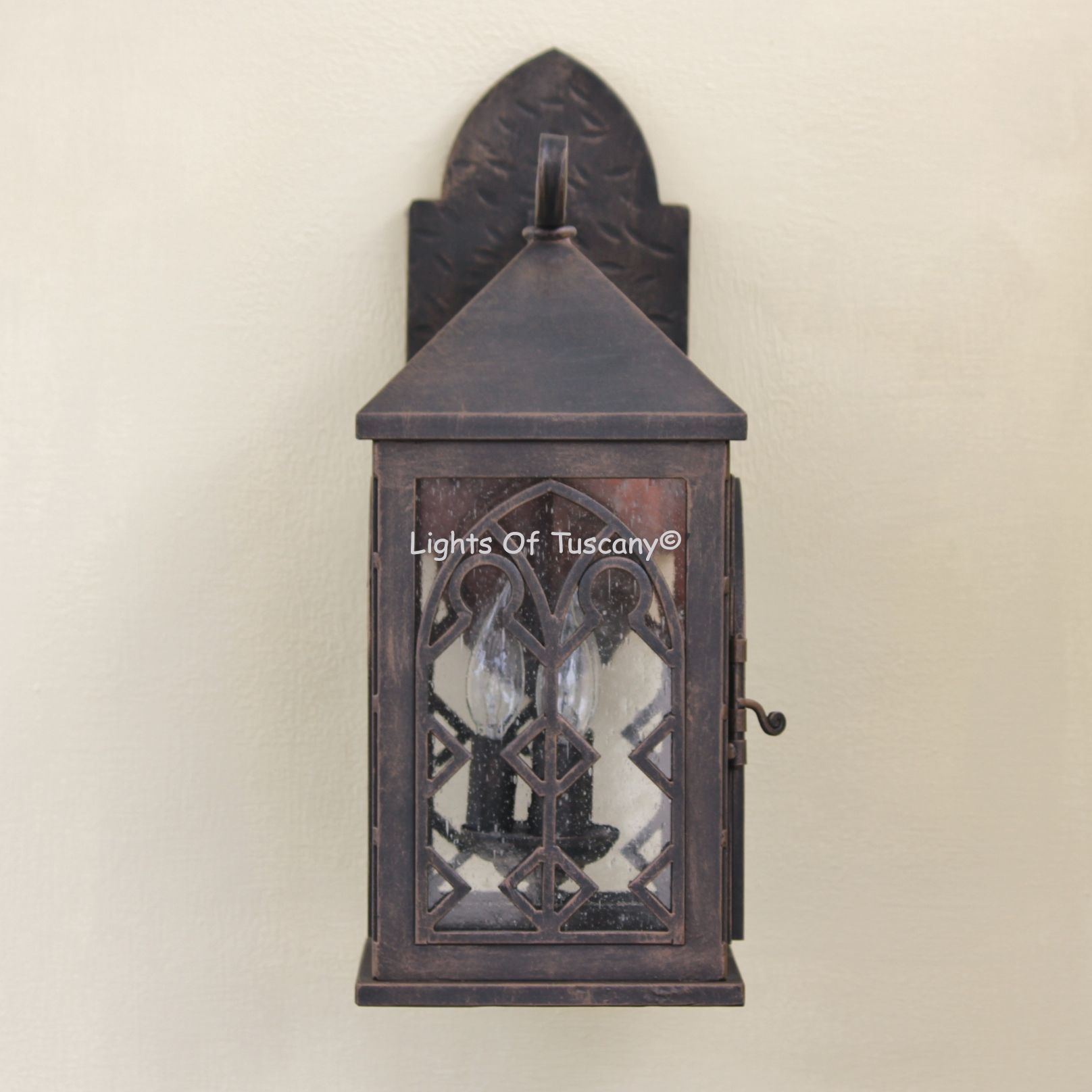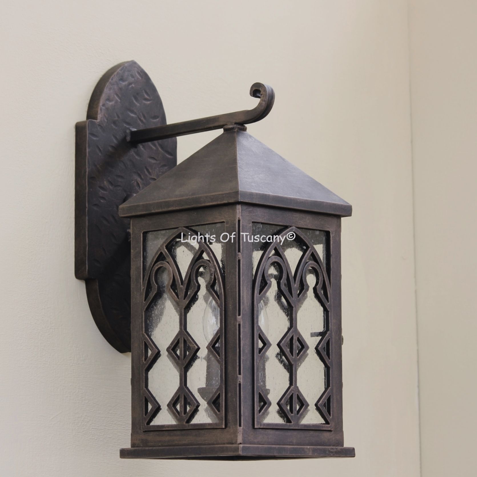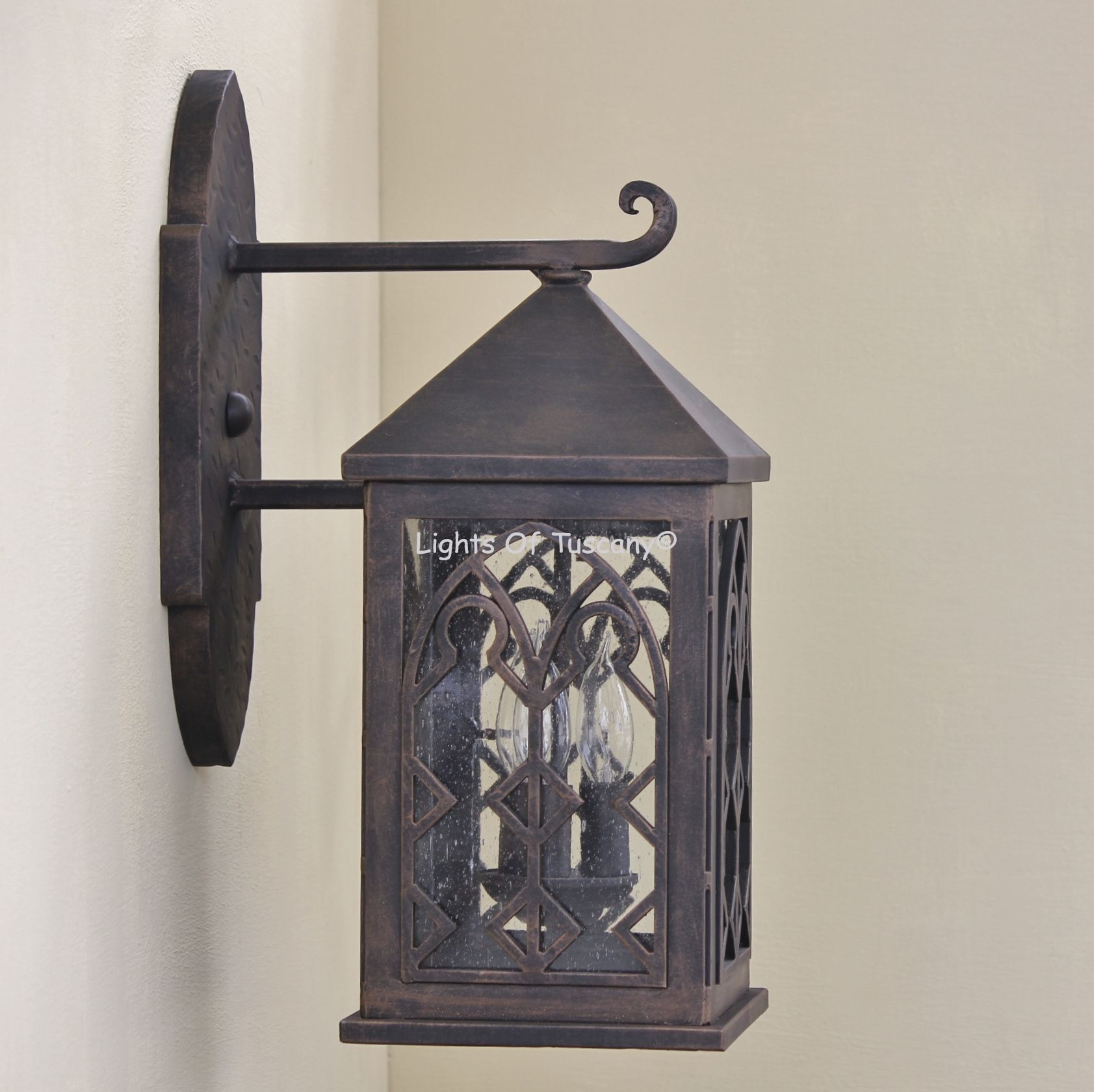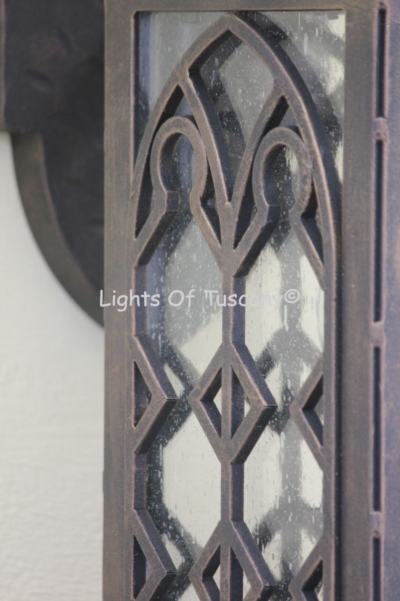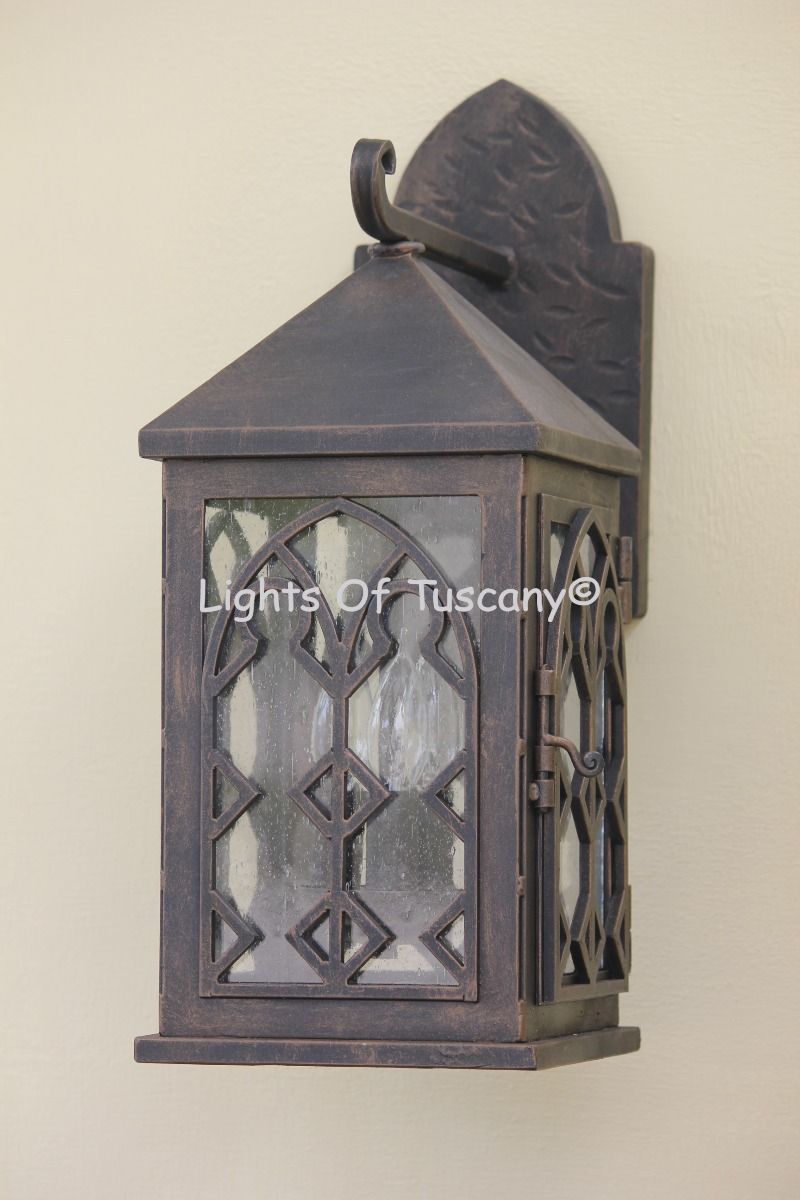This beautiful hand crafted outdoor wall light is made of all authentic hand forged wrought iron. All our fixtures are hand painted and available in any of our finish options. This fixture is perfect for garage lighting, outdoor walls, backyard and patio lighting.