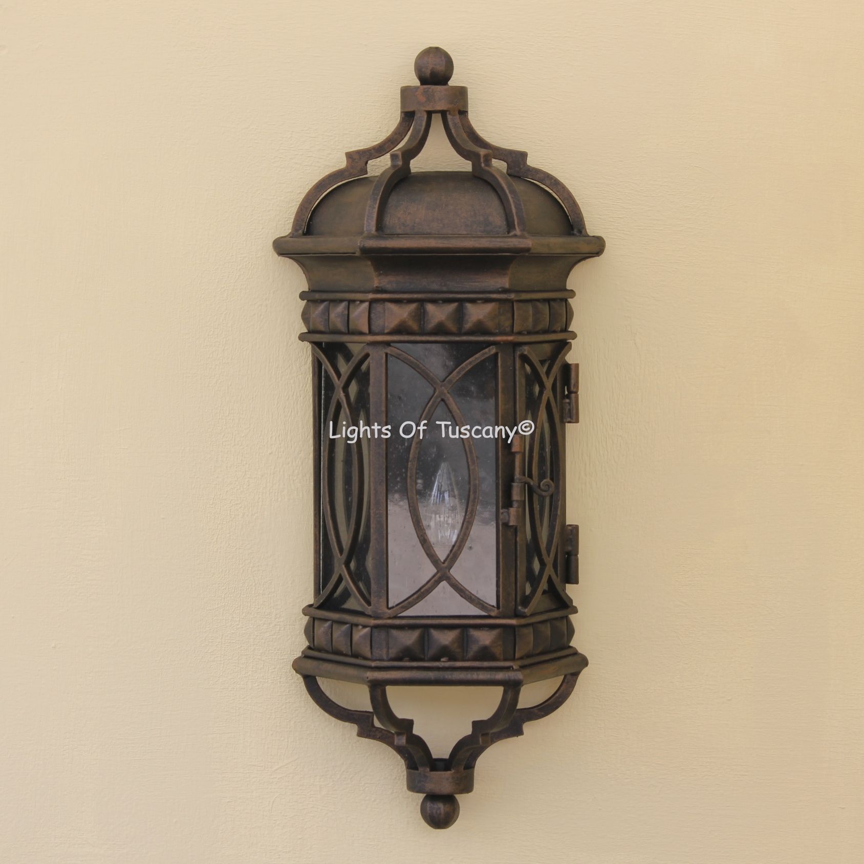 This beautiful hand crafted outdoor wall light is made of all authentic hand forged wrought iron. All our fixtures are hand painted and available in any of our finish options. This fixture is perfect for garage lighting, outdoor walls, backyard and patio lighting.