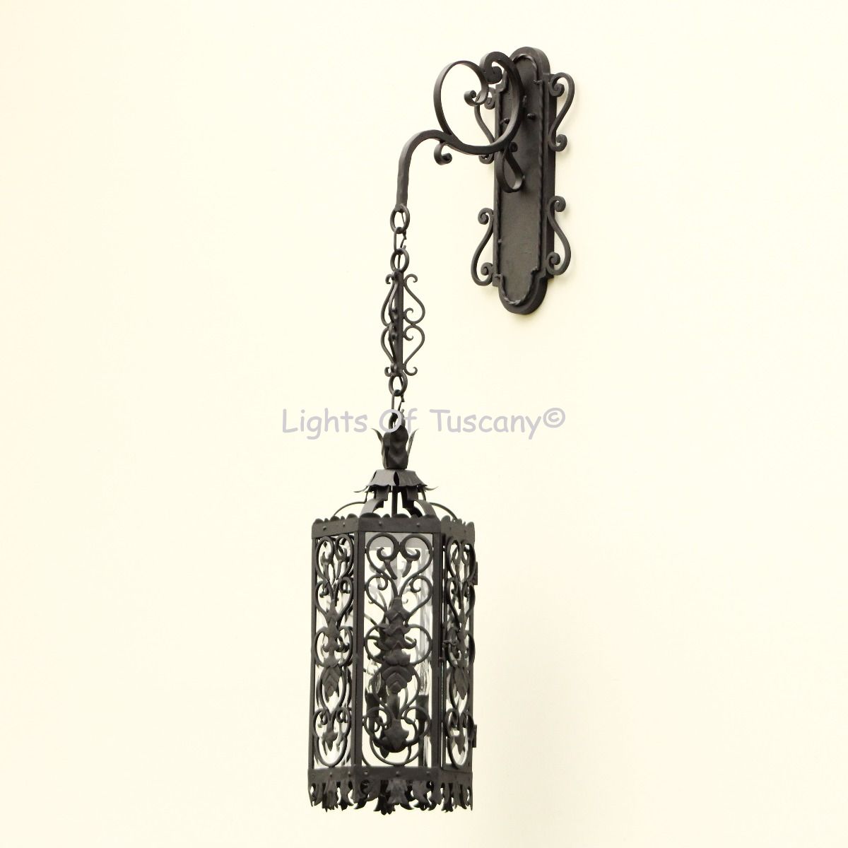 Infuse your outdoor spaces with the charm of Spanish and Mexican-inspired design through this handcrafted wrought iron lantern. Featuring intricate scrollwork and ornate details, this lantern evokes the elegance of traditional hacienda-style architecture. The gracefully curved arm and chain suspension reflect classic Spanish colonial craftsmanship, adding an authentic old-world aesthetic.